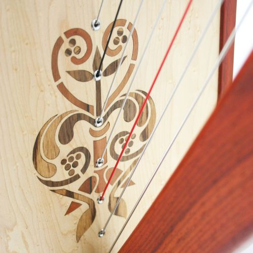 Eine stiliserte Ranke als Intarsie auf einer Harfe.