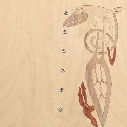 Wooden marquetry or mother of pearl as inlay on the soundboard.