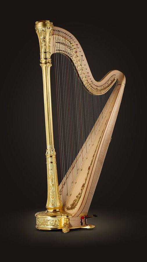 A romantic harp designed by Lyon & Healy in 1919, the Style 11 is characterized by a classic Art Nouveau motif of fluid vertical lines, flowers and vine tendrils which are hand-carved into the Hard Maple column, base and feet. The harp is hand-gilded with 23+ karat gold leaf and burnished to highlight the intricacies of the hand-carved wood. Soft floral decoration accents the extended soundboard which also features a double Rosewood inlay along the edges.
